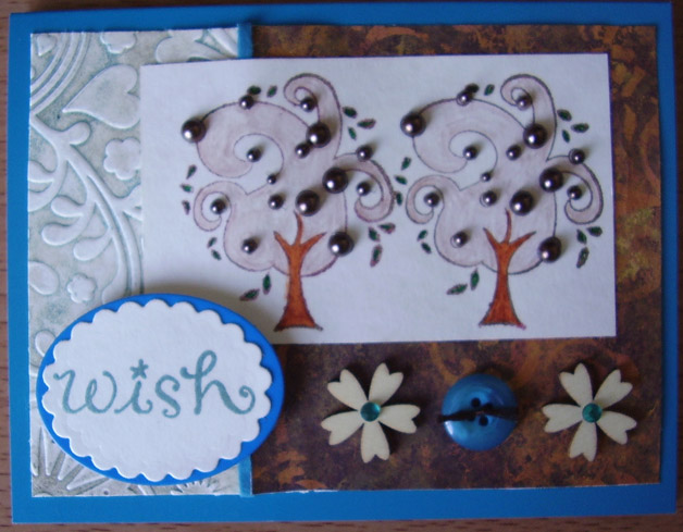 2) Totally Papercrafts Weekly Challenge(http://totallypapercrafts.blogspot.com/). This was a 1 - 2 - 3 challenge: 1 image, 2 papers and 3 embellishments. For the background paper on the left side of the card I used the same card as the image and then inked a cuttlebug folder with turquoise and chocolate ink.